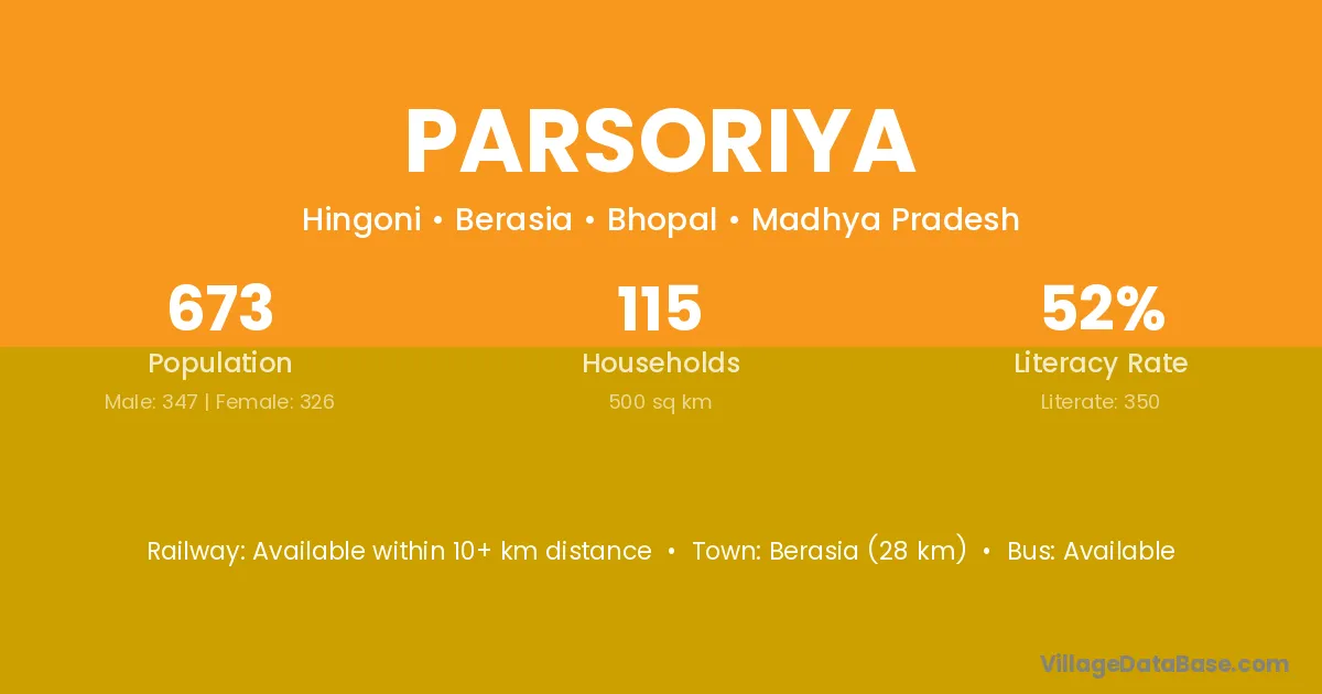 Berasia (28 km) is the nearest town to Parsoriya village for major economic activities and is located approximately 28 km away.