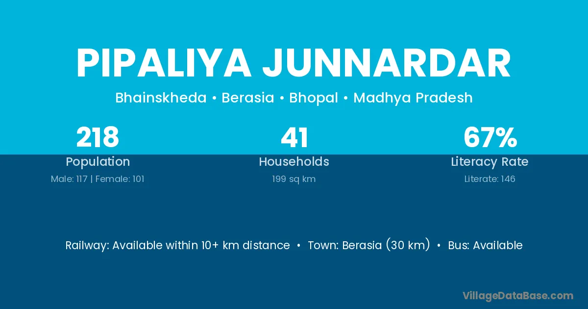 Berasia (30 km) is the nearest town to Pipaliya Junnardar village for major economic activities and is located approximately 30 km away.