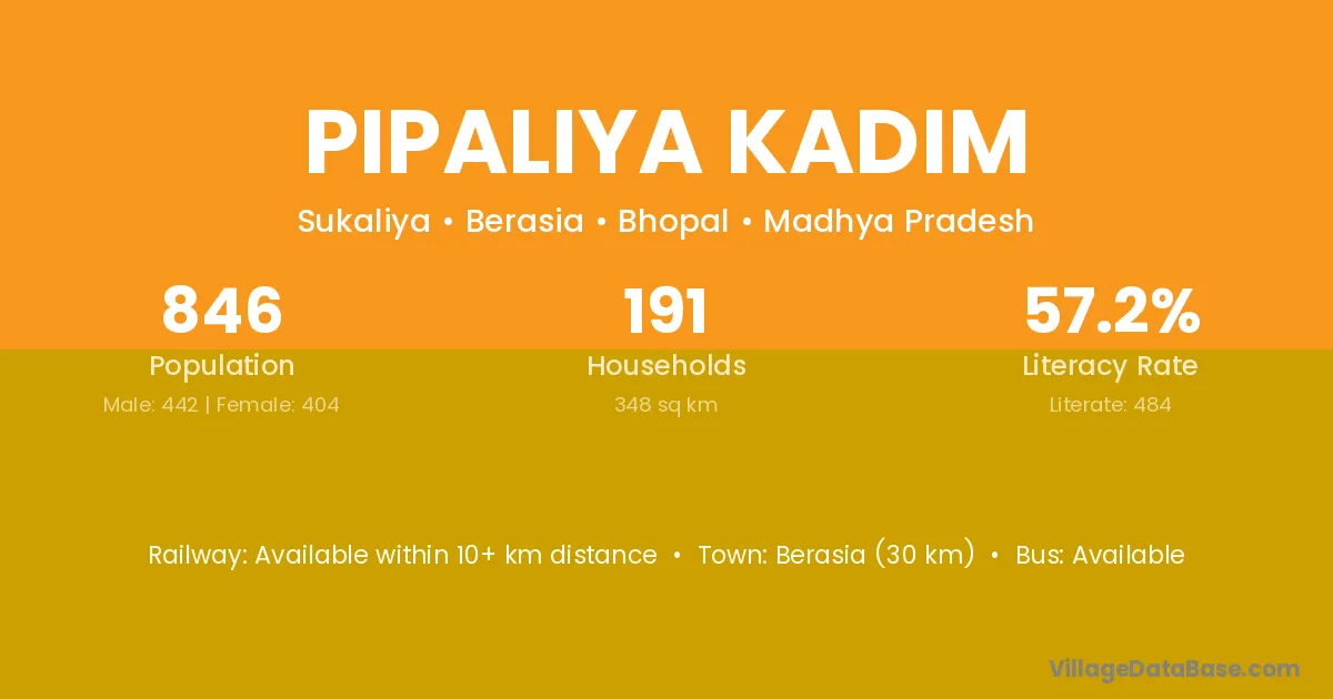 Berasia (30 km) is the nearest town to Pipaliya Kadim village for major economic activities and is located approximately 30 km away.