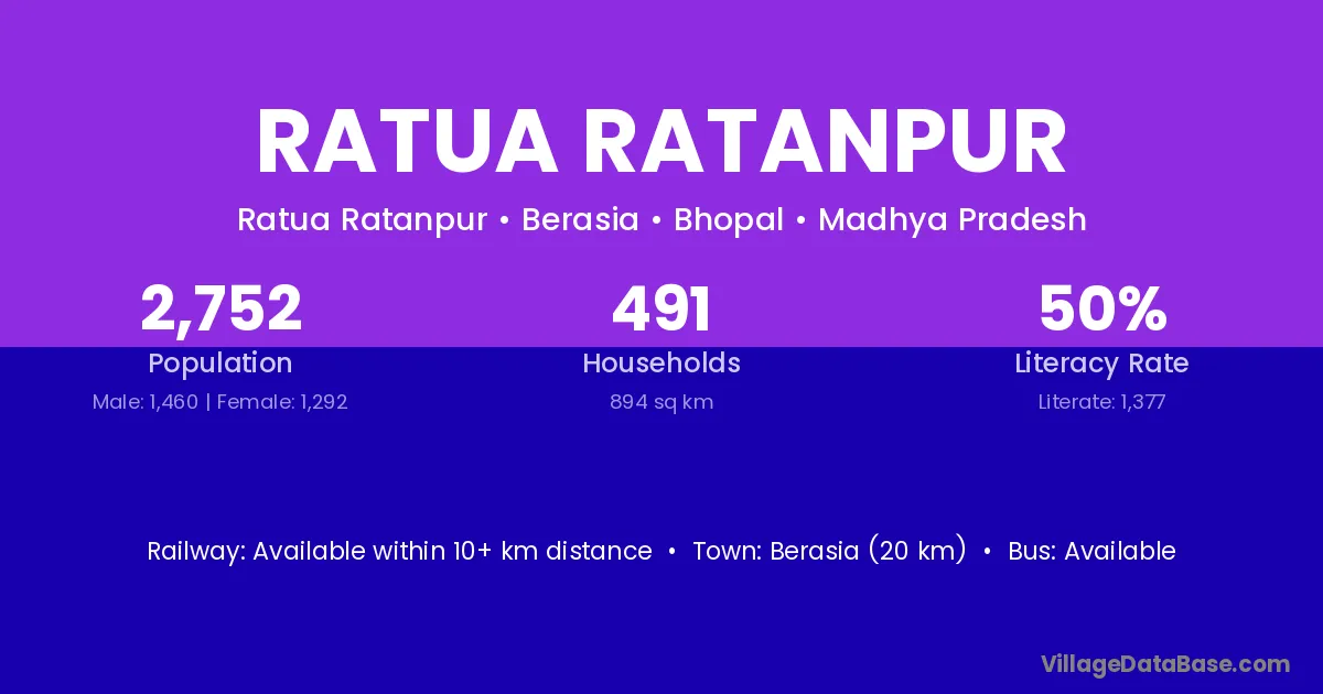 Berasia (20 km) is the nearest town to Ratua Ratanpur village for major economic activities and is located approximately 20 km away.
