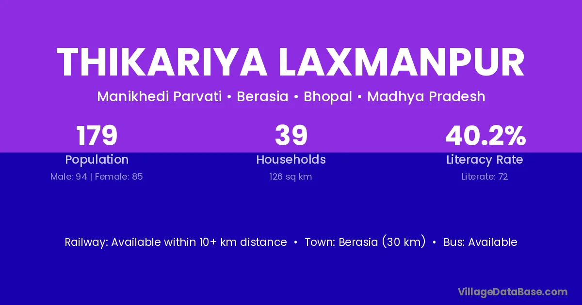 Berasia (30 km) is the nearest town to Thikariya Laxmanpur village for major economic activities and is located approximately 30 km away.