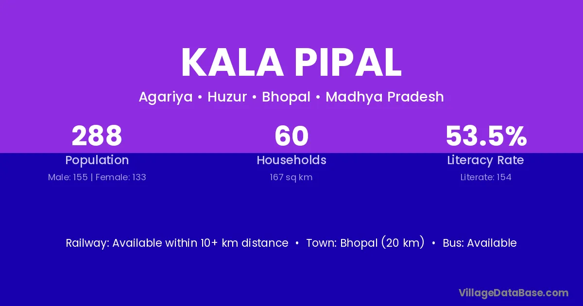 Bhopal (20 km) is the nearest town to Kala Pipal village for major economic activities and is located approximately 20 km away.