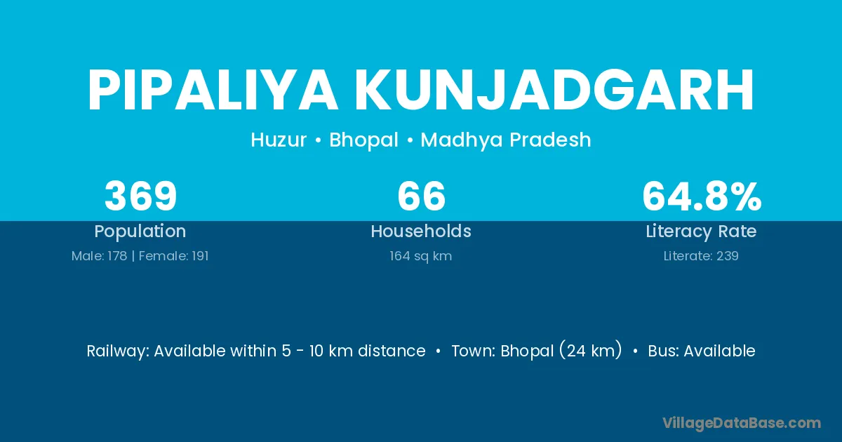 Bhopal (24 km) is the nearest town to Pipaliya Kunjadgarh village for major economic activities and is located approximately 24 km away.