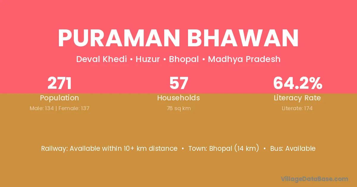 Bhopal (14 km) is the nearest town to Puraman Bhawan village for major economic activities and is located approximately 14 km away.