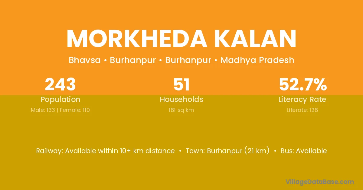 Burhanpur (21 km) is the nearest town to Morkheda Kalan village for major economic activities and is located approximately 21 km away.