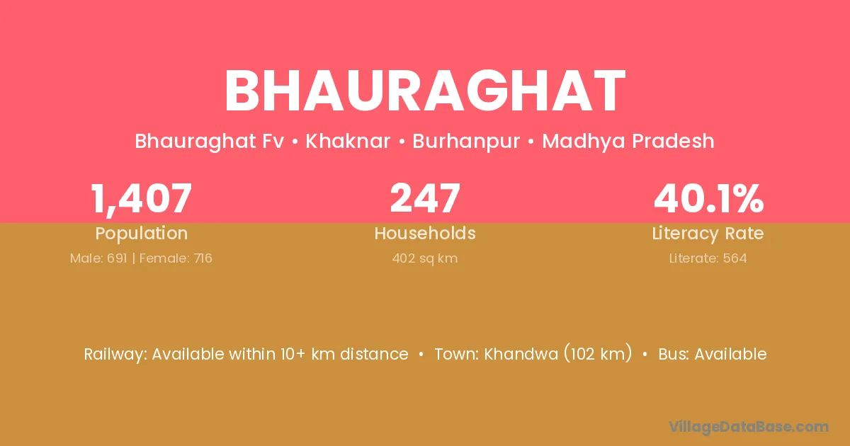 Khandwa (102 km) is the nearest town to Bhauraghat village for major economic activities and is located approximately 102 km away.