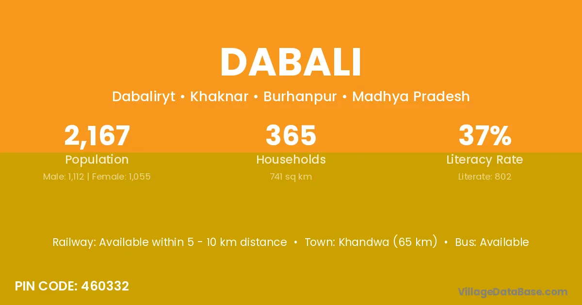 Khandwa (65 km) is the nearest town to Dabali village for major economic activities and is located approximately 65 km away.