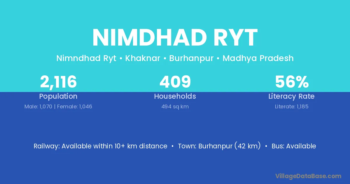 Burhanpur (42 km) is the nearest town to Nimdhad Ryt village for major economic activities and is located approximately 42 km away.