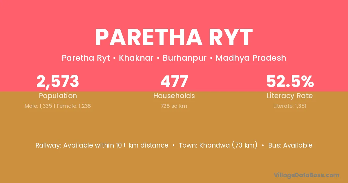 Khandwa (73 km) is the nearest town to Paretha Ryt village for major economic activities and is located approximately 73 km away.