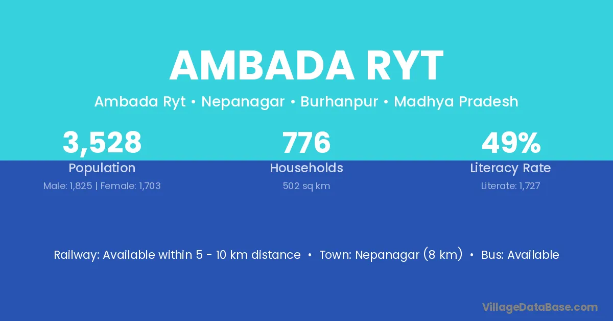 Nepanagar (8 km) is the nearest town to Ambada Ryt village for major economic activities and is located approximately 8 km away.