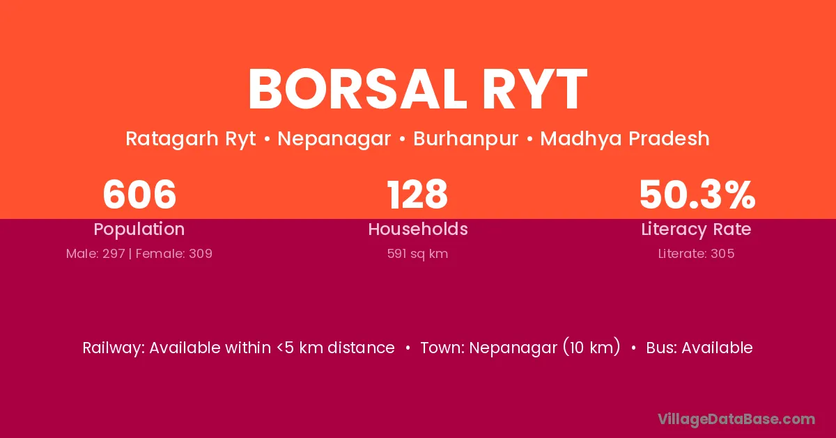 Nepanagar (10 km) is the nearest town to Borsal Ryt village for major economic activities and is located approximately 10 km away.