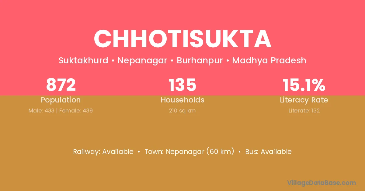 Chhotisukta village has a total population of 872 people, of which 433 are males and 439 are females.