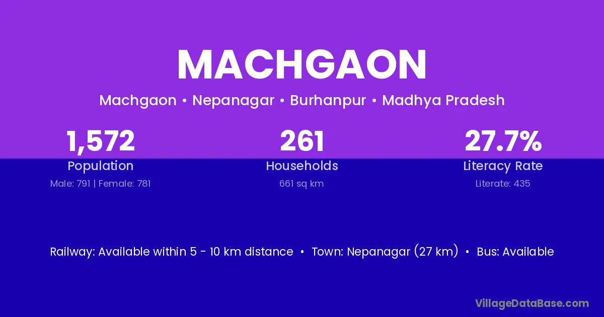 Nepanagar (27 km) is the nearest town to Machgaon village for major economic activities and is located approximately 27 km away.