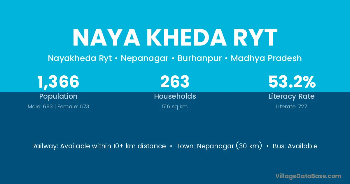 Naya Kheda Ryt village has a total population of 1,366 people, of which 693 are males and 673 are females.