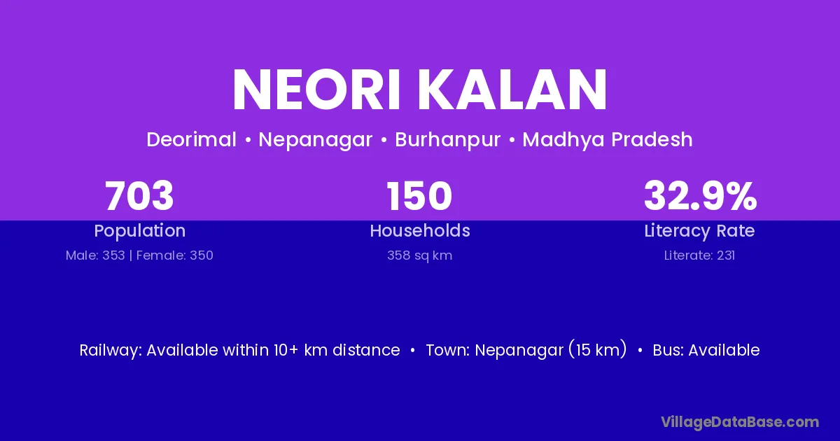 Nepanagar (15 km) is the nearest town to Neori Kalan village for major economic activities and is located approximately 15 km away.