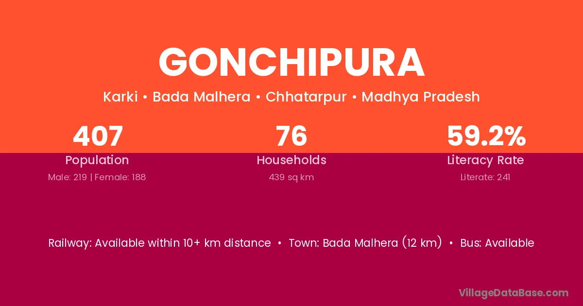 Bada Malhera (12 km) is the nearest town to Gonchipura village for major economic activities and is located approximately 12 km away.