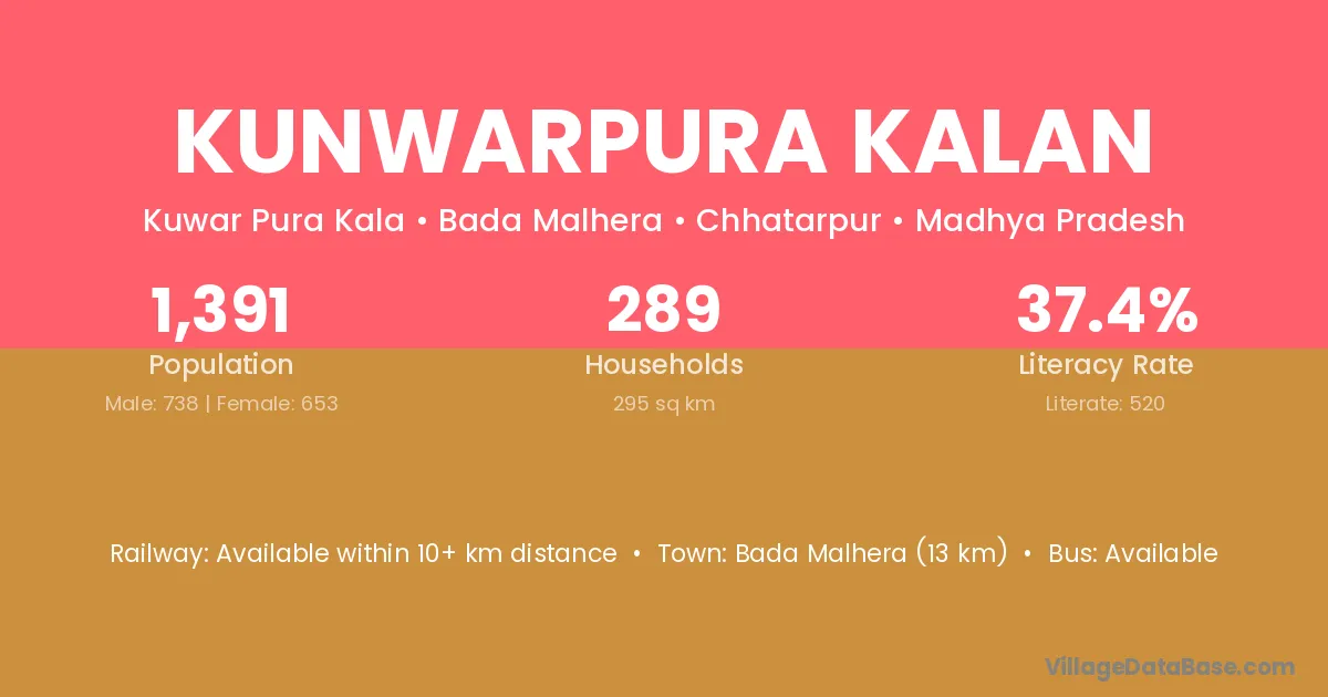 Bada Malhera (13 km) is the nearest town to Kunwarpura Kalan village for major economic activities and is located approximately 13 km away.