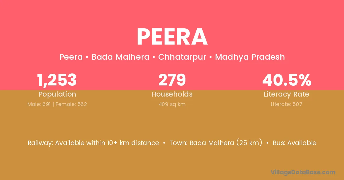 Bada Malhera (25 km) is the nearest town to Peera village for major economic activities and is located approximately 25 km away.