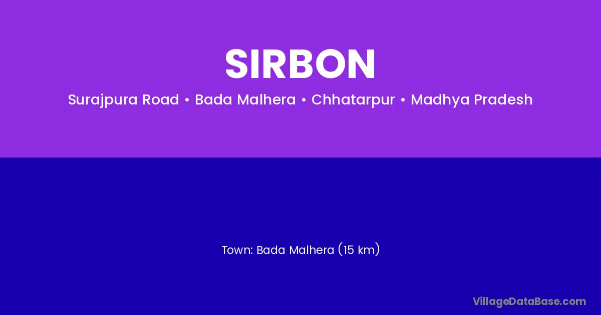 Bada Malhera (15 km) is the nearest town to Sirbon village for major economic activities and is located approximately 15 km away.