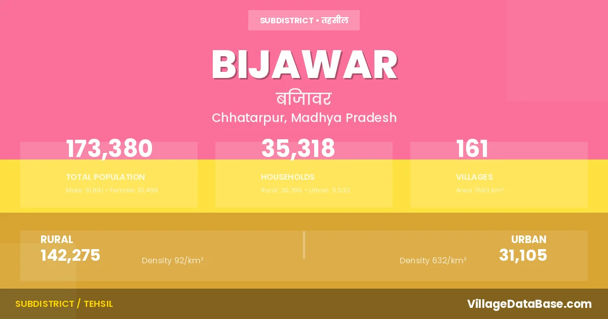 According to the 2011 census The total area of Bijawar Tehsil is 1593 km², with a population of 173380 people. The population density is 109 inhabitants per square kilometre, and there are approximately 35318 houses in the sub district.