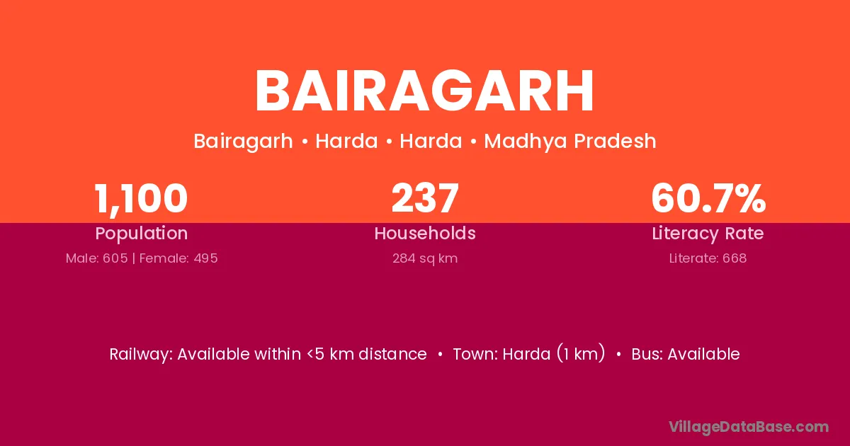 The literacy rate of Bairagarh village is 45.52%. Male literacy stands at 55.70% and female literacy at 33.85%.