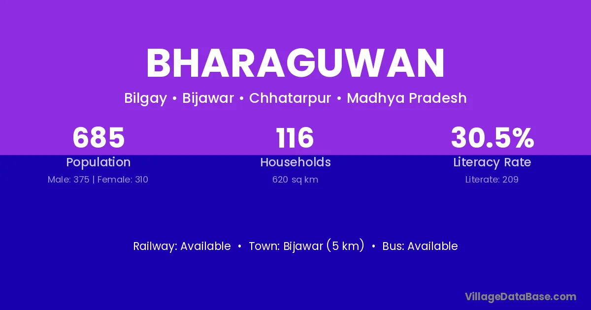 Bharaguwan village has a total population of 685 people, of which 375 are males and 310 are females.