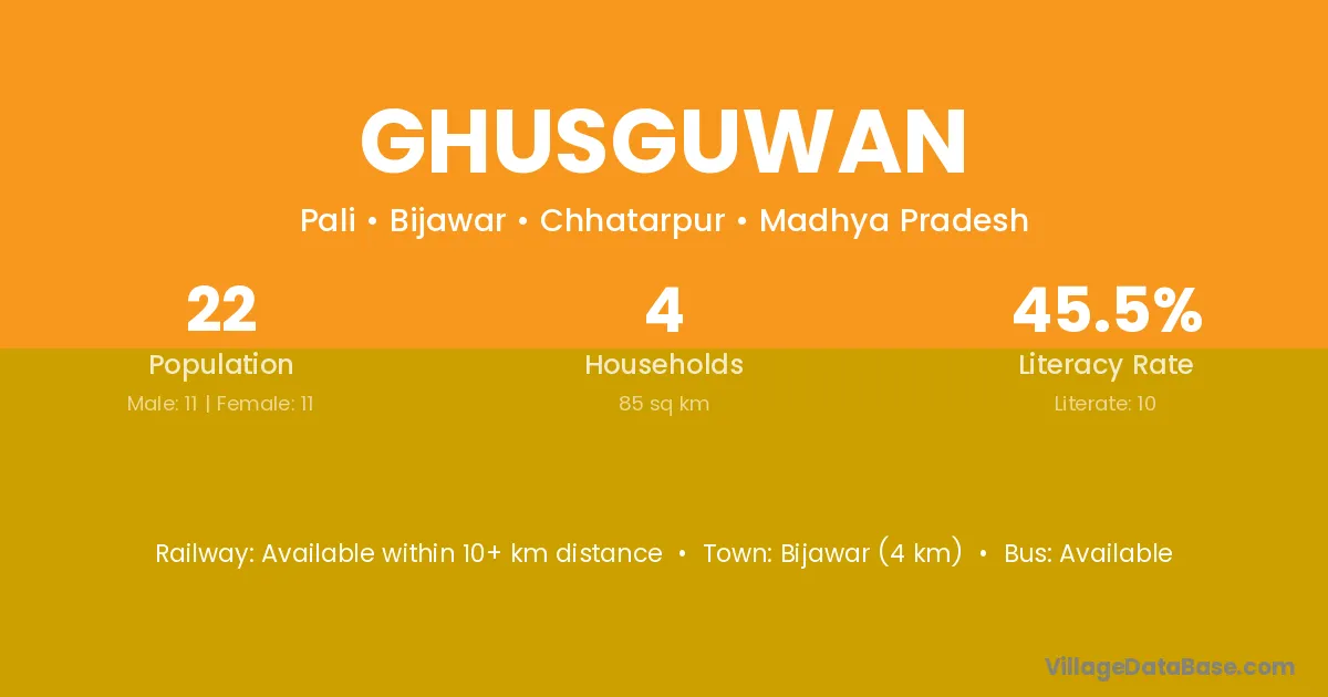 Ghusguwan village has a total population of 22 people, of which 11 are males and 11 are females.