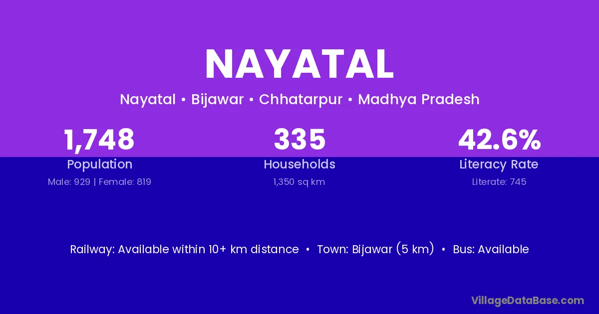 Bijawar (5 km) is the nearest town to Nayatal village for major economic activities and is located approximately 5 km away.