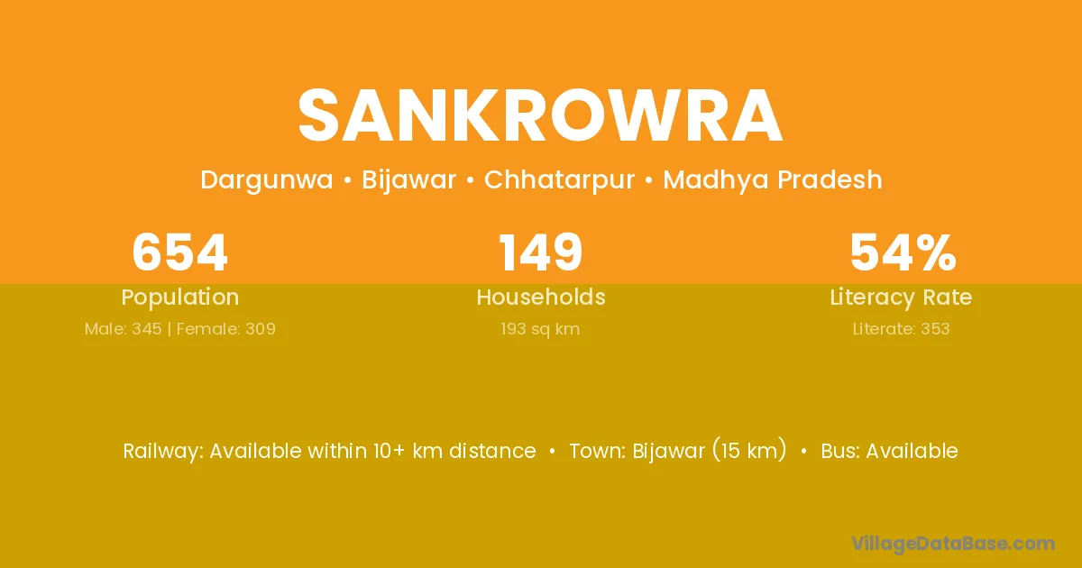 Bijawar (15 km) is the nearest town to Sankrowra village for major economic activities and is located approximately 15 km away.