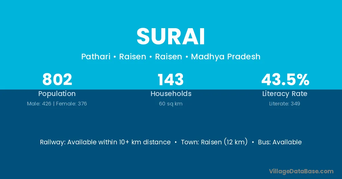 Bijawar (48 km) is the nearest town to Surai village for major economic activities and is located approximately 48 km away.