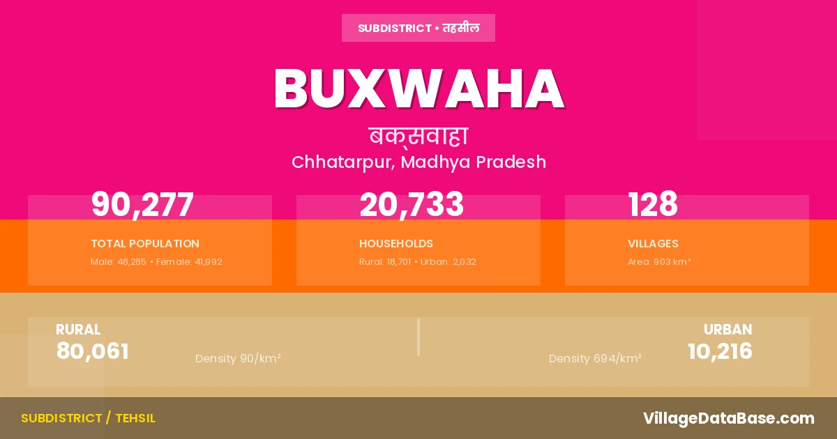 According to the 2011 census The total area of Buxwaha Tehsil is 903 km², with a population of 90277 people. The population density is 100 inhabitants per square kilometre, and there are approximately 20733 houses in the sub district.