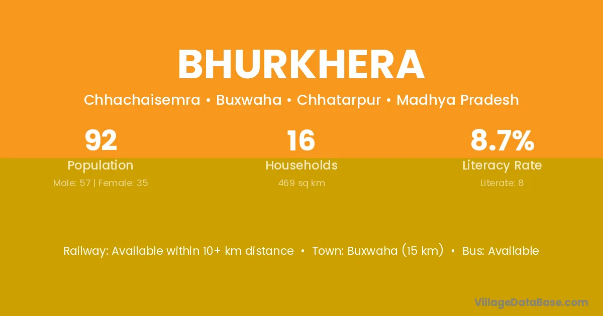 Buxwaha (15 km) is the nearest town to Bhurkhera village for major economic activities and is located approximately 15 km away.