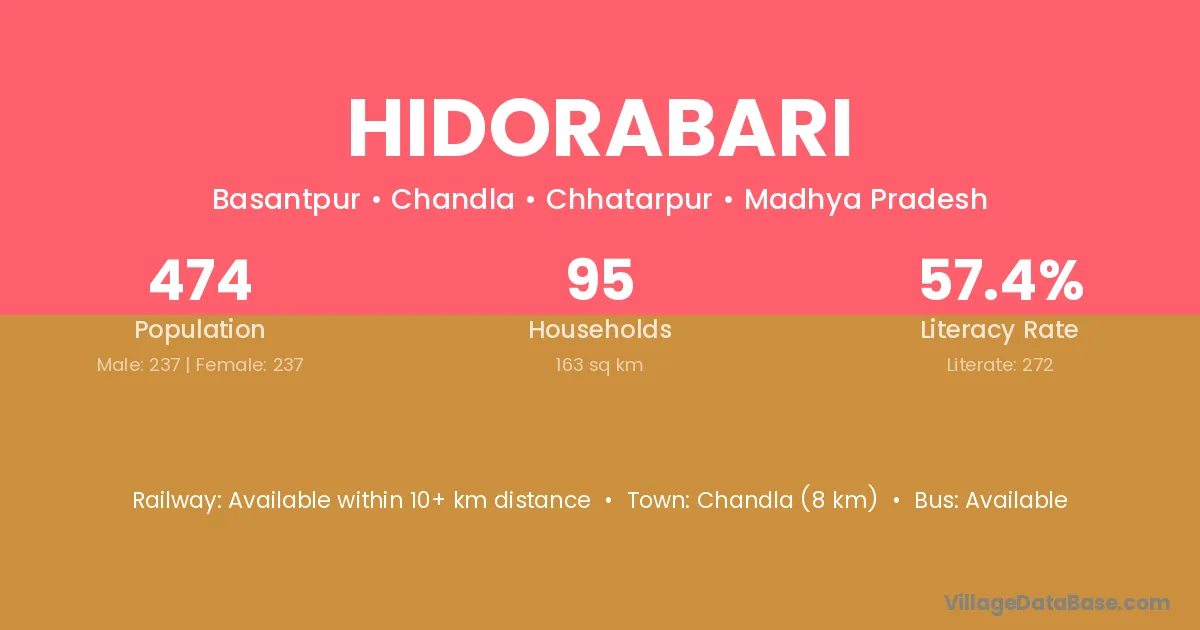 Hidorabari village has a total population of 474 people, of which 237 are males and 237 are females.