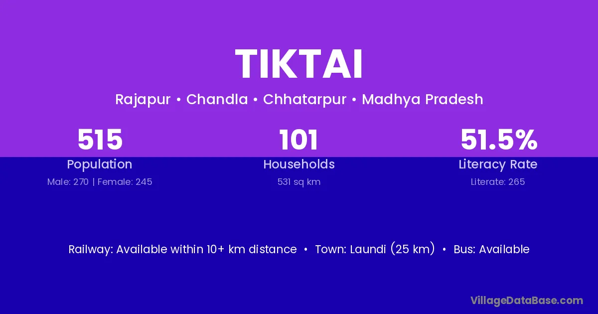 Tiktai village has a total population of 515 people, of which 270 are males and 245 are females.