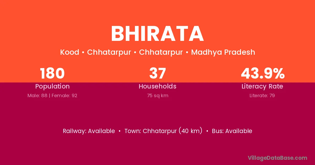 Chhatarpur (40 km) is the nearest town to Bhirata village for major economic activities and is located approximately 40 km away.