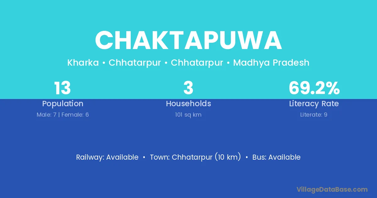 Chhatarpur (10 km) is the nearest town to Chaktapuwa village for major economic activities and is located approximately 10 km away.