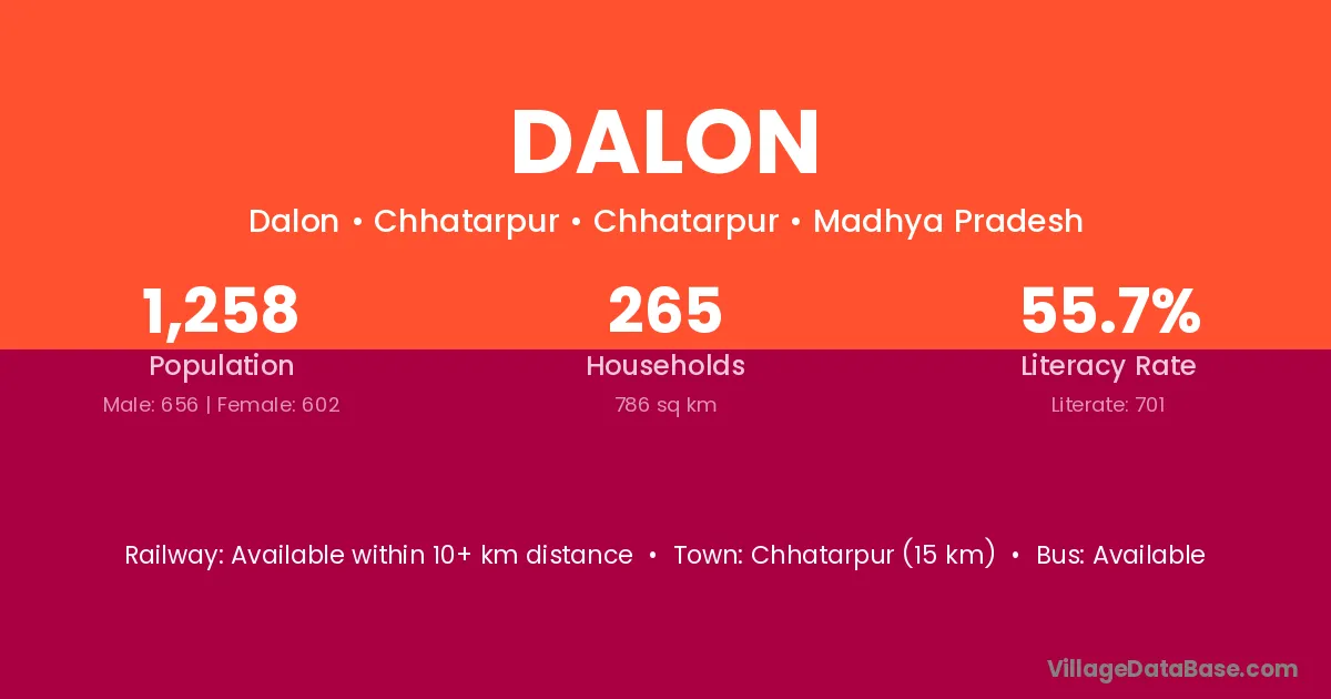 Dalon village has a total population of 1,258 people, of which 656 are males and 602 are females.