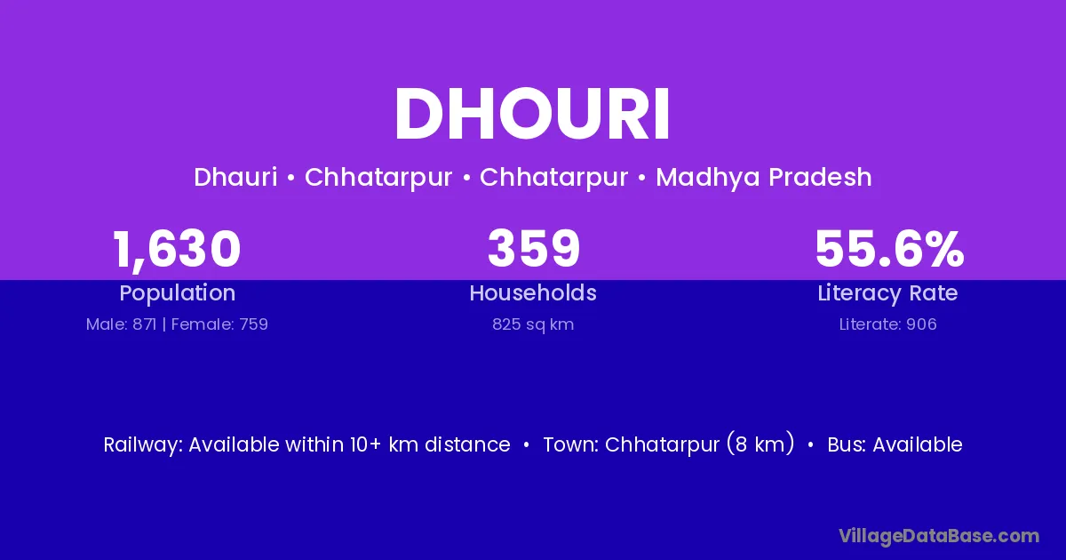 Chhatarpur (8 km) is the nearest town to Dhouri village for major economic activities and is located approximately 8 km away.