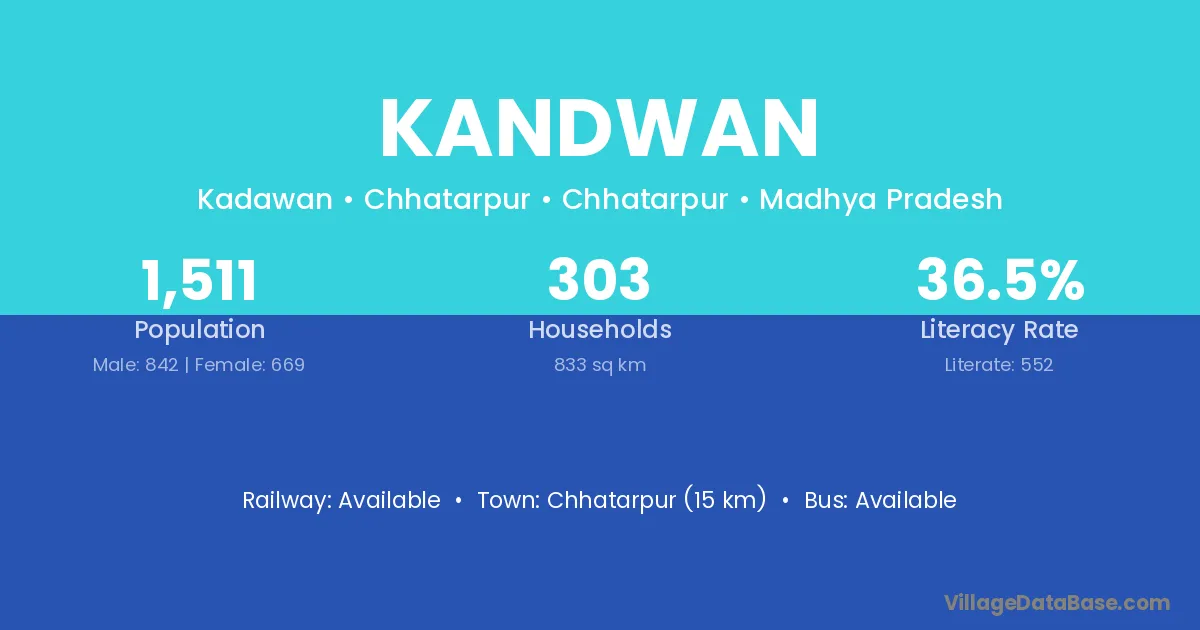 Chhatarpur (15 km) is the nearest town to Kandwan village for major economic activities and is located approximately 15 km away.