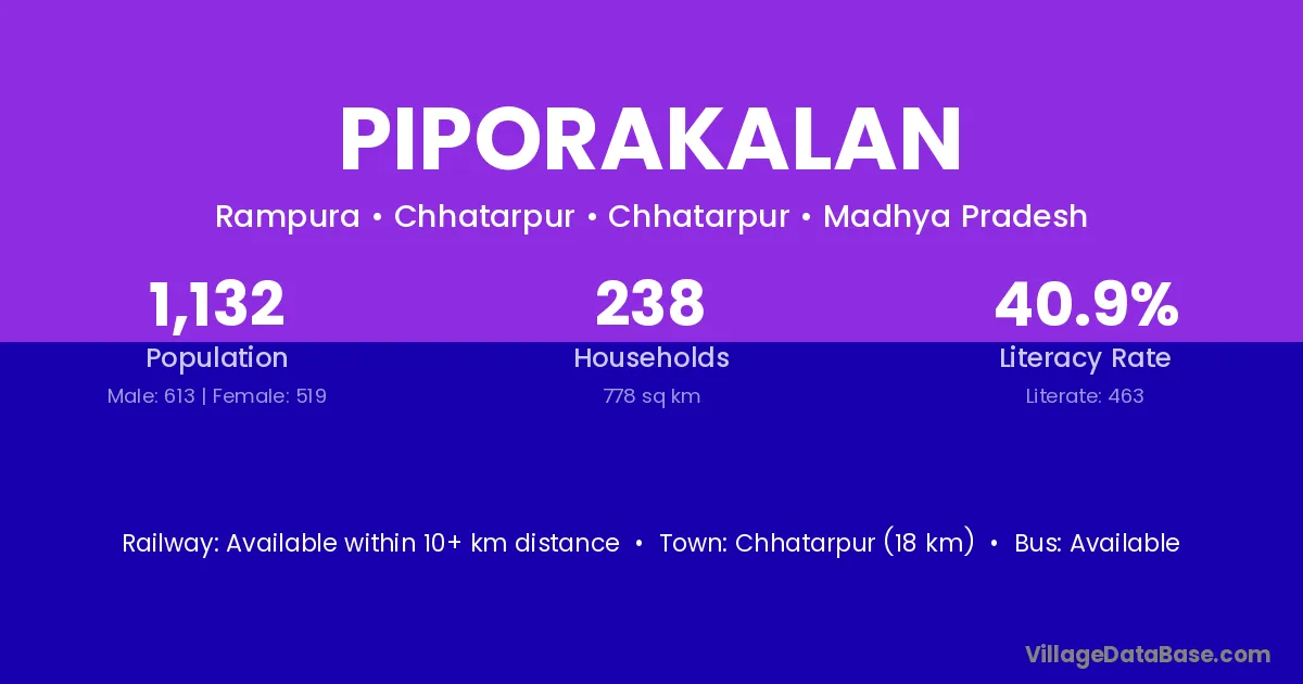 Chhatarpur (18 km) is the nearest town to Piporakalan village for major economic activities and is located approximately 18 km away.