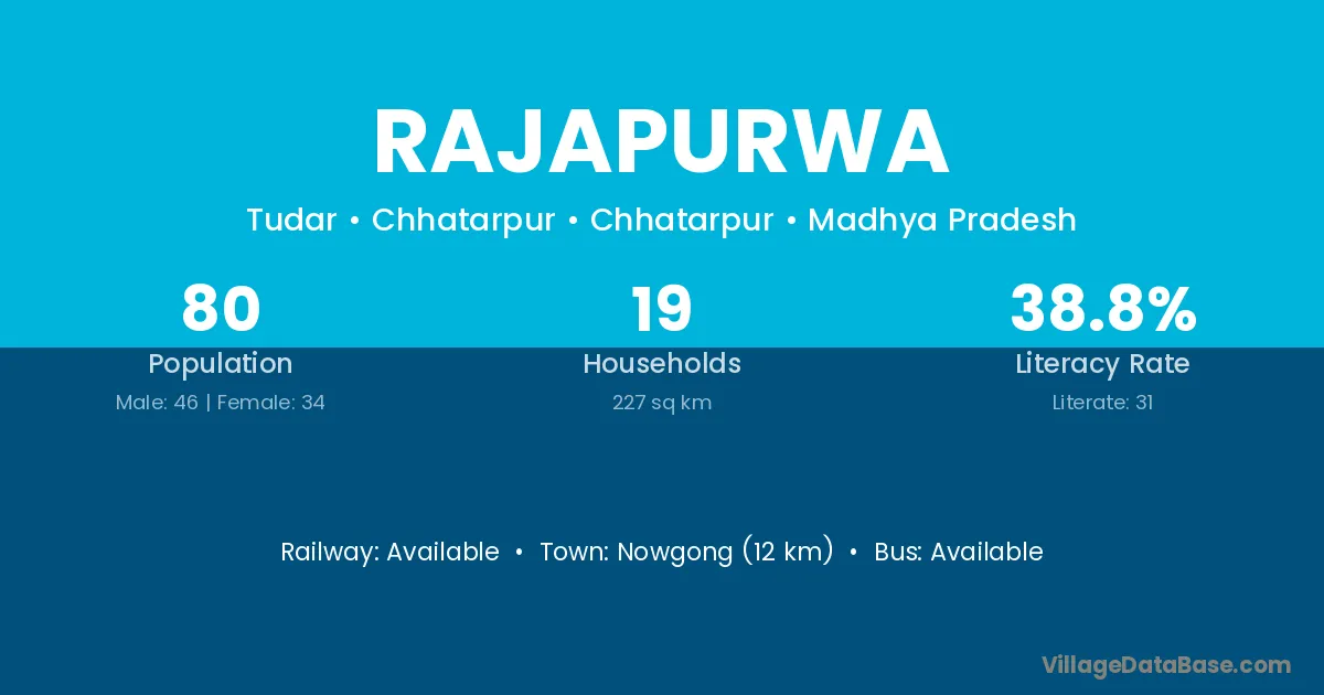 Rajapurwa village has a total population of 80 people, of which 46 are males and 34 are females.