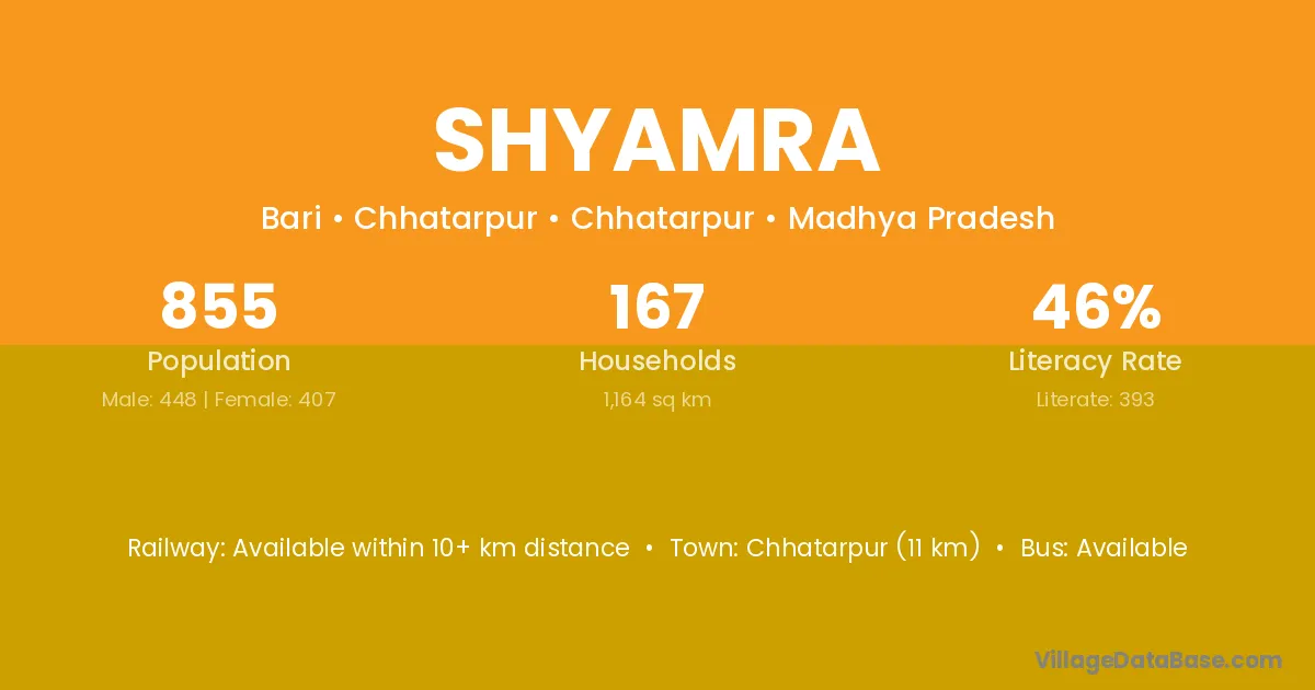 Chhatarpur (11 km) is the nearest town to Shyamra village for major economic activities and is located approximately 11 km away.
