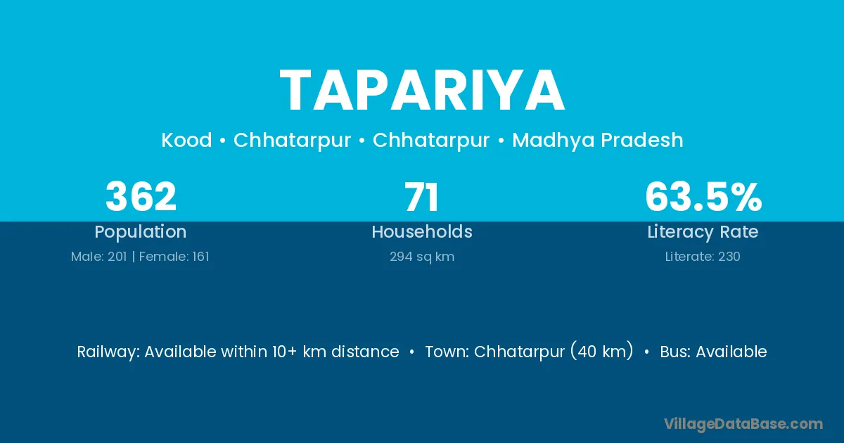 Chhatarpur (40 km) is the nearest town to Tapariya village for major economic activities and is located approximately 40 km away.