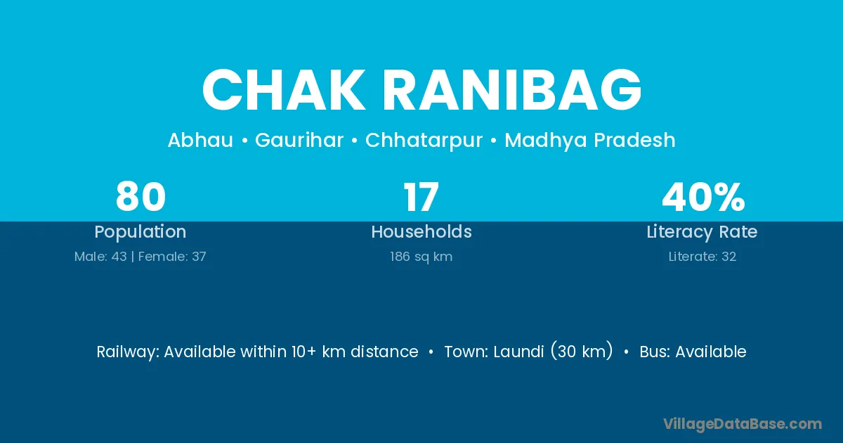 Chak Ranibag village has a total population of 80 people, of which 43 are males and 37 are females.