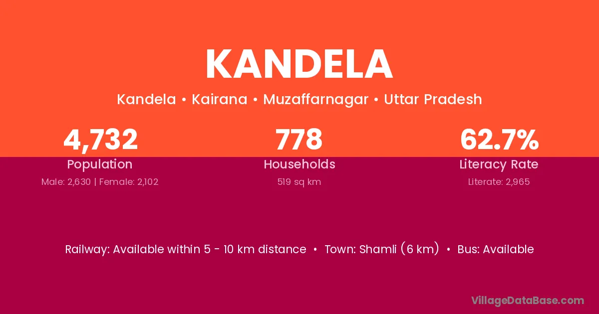 The literacy rate of Kandela village is 55.57%. Male literacy stands at 63.28% and female literacy at 46.23%.