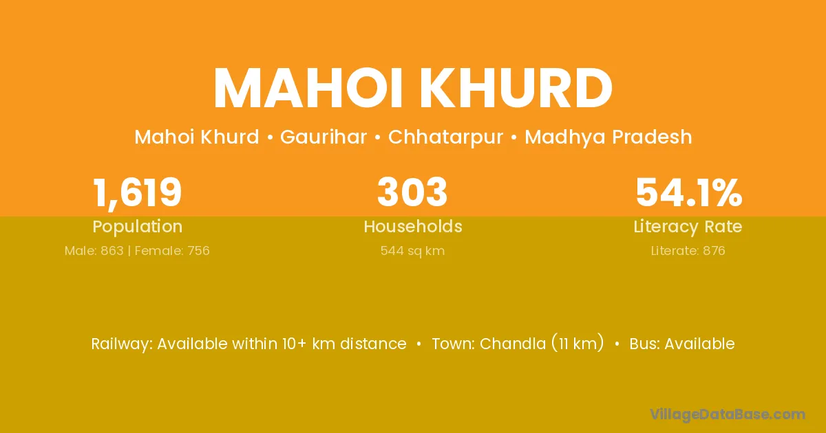 Mahoi Khurd village has a total population of 1,619 people, of which 863 are males and 756 are females.