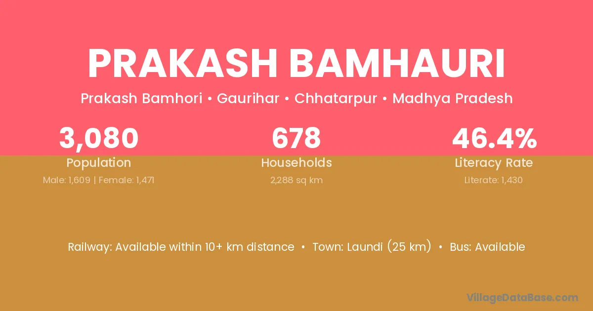 Laundi (25 km) is the nearest town to Prakash Bamhauri village for major economic activities and is located approximately 25 km away.