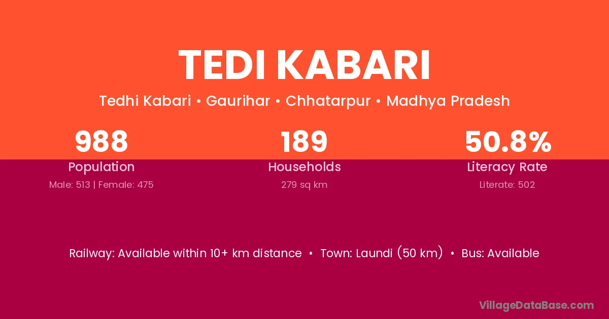 Tedi Kabari village has a total population of 988 people, of which 513 are males and 475 are females.