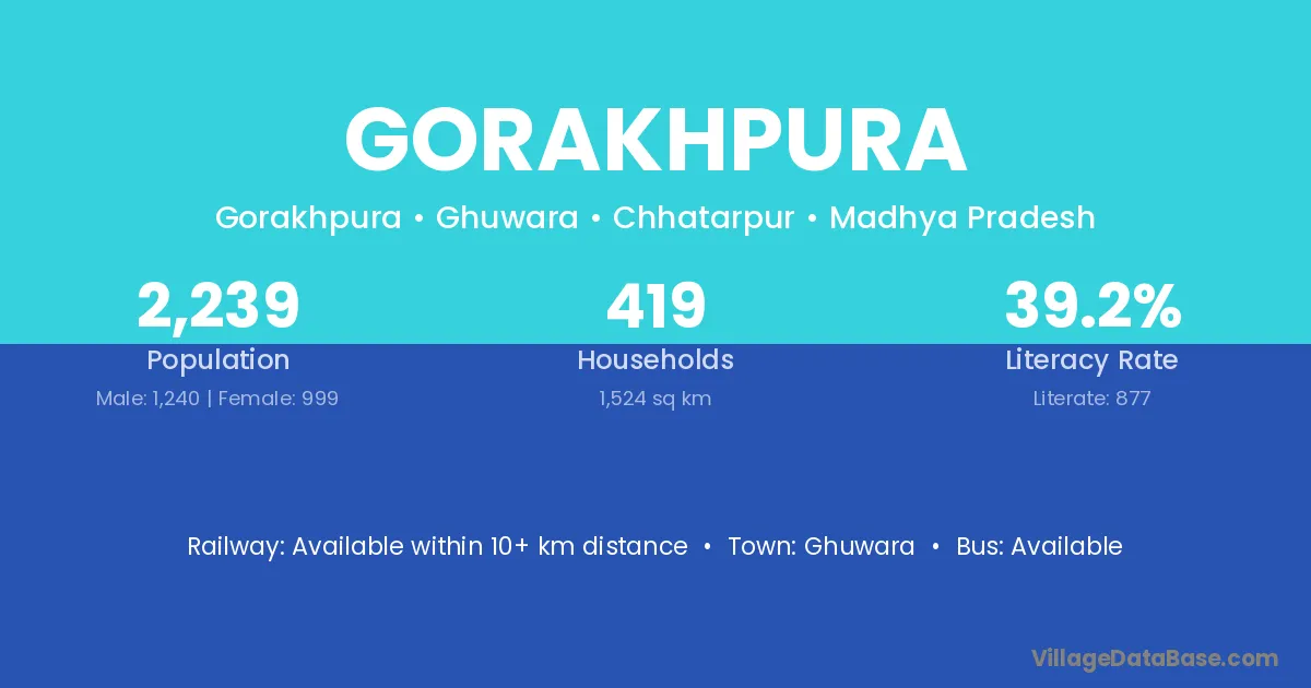 Gorakhpura village has a total population of 2,239 people, of which 1,240 are males and 999 are females.