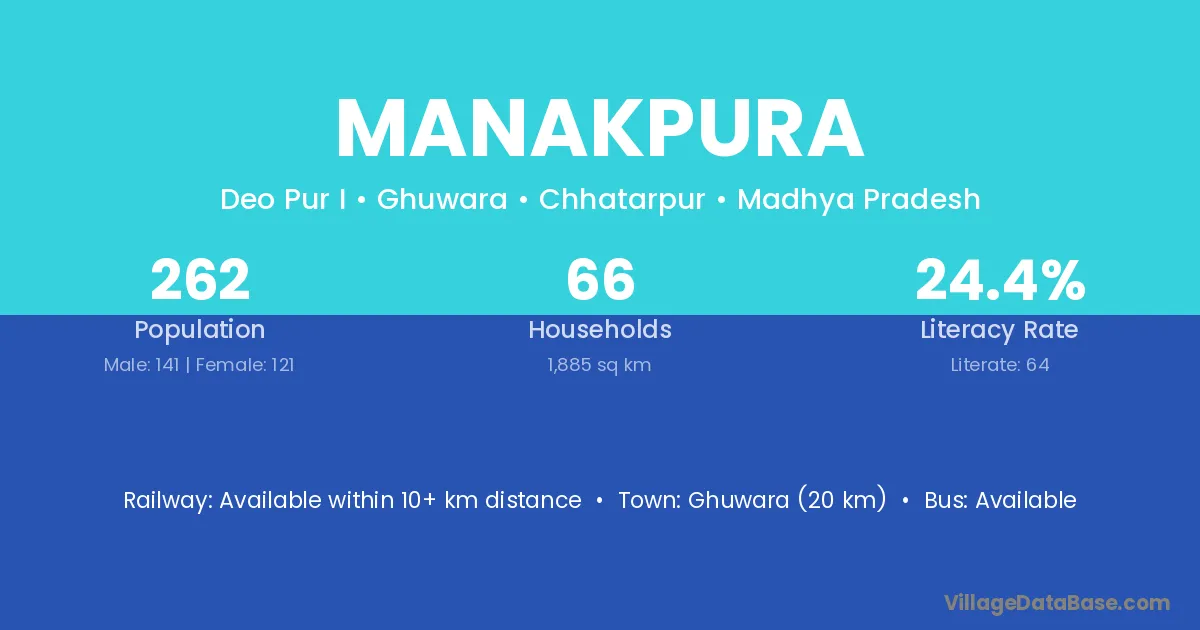 Ghuwara (20 km) is the nearest town to Manakpura village for major economic activities and is located approximately 20 km away.